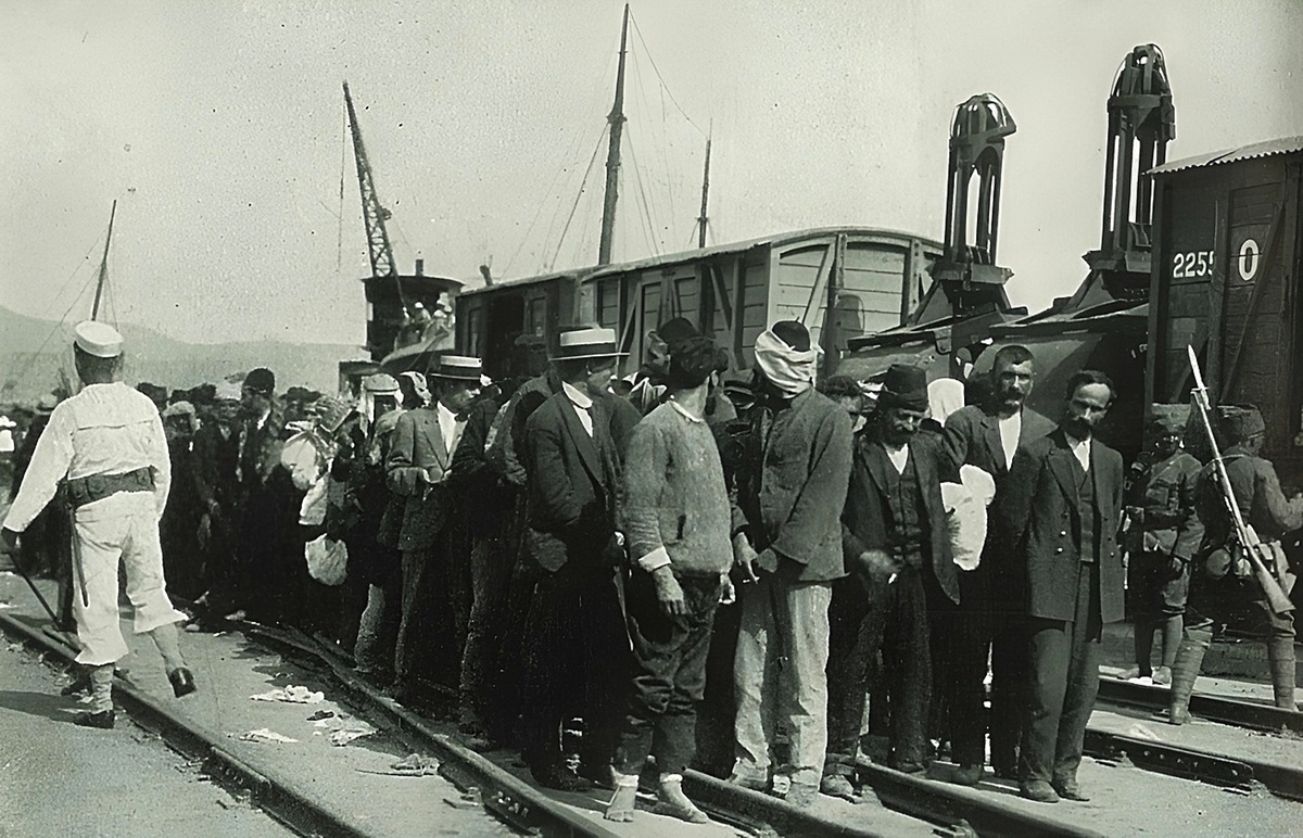 Weeding out Men for Deportation: Smyrna. After the fire these unfortunates, being between the age limits of 17 and 45 years, were not permitted to leave Smyrna with their families, but were sent back to the interior of Anatolia. Source: The National Geographic Magazine, Nov 1925, p. 562.